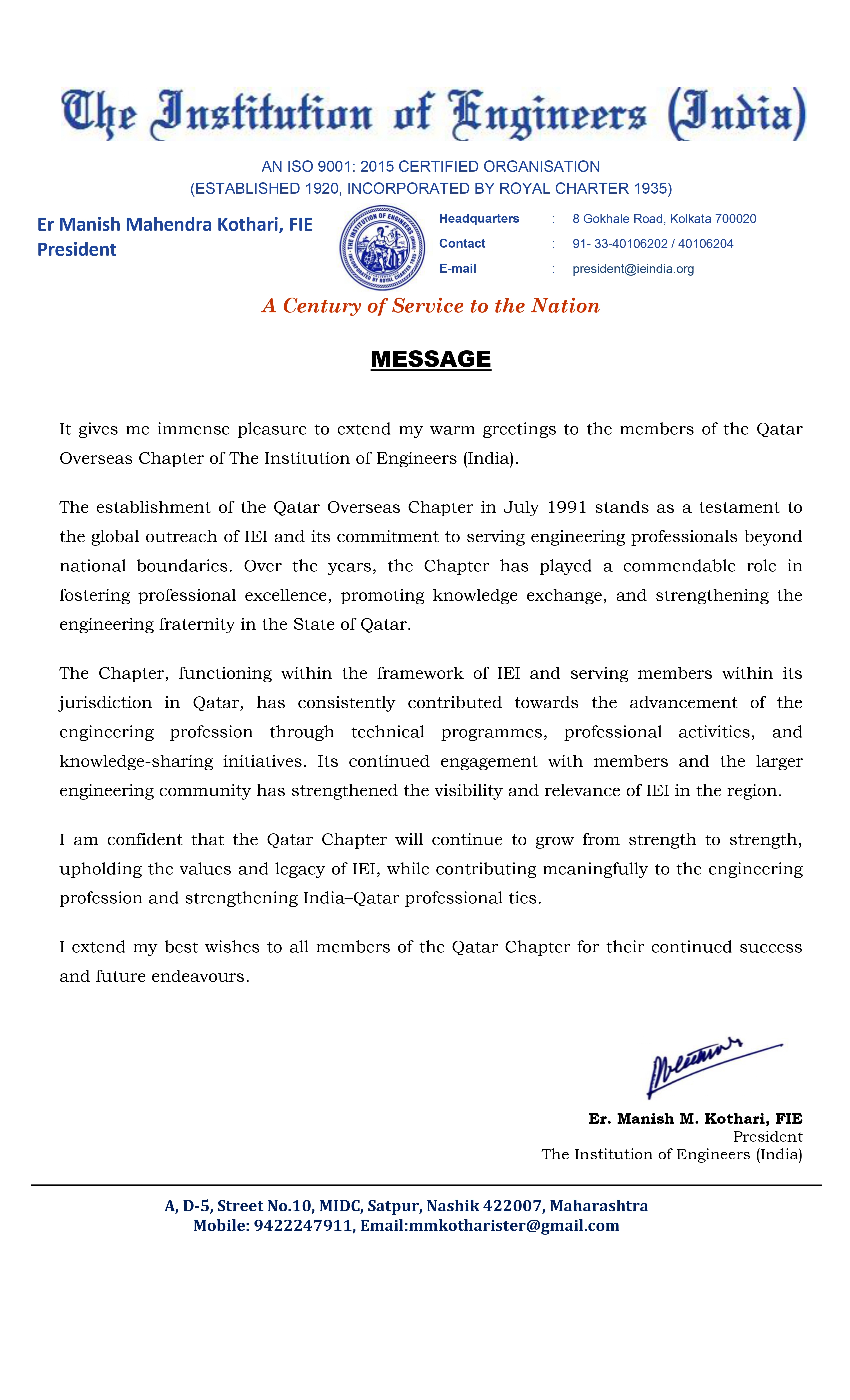 MESSAGE FROM THE PRESIDENT, IEI HQ